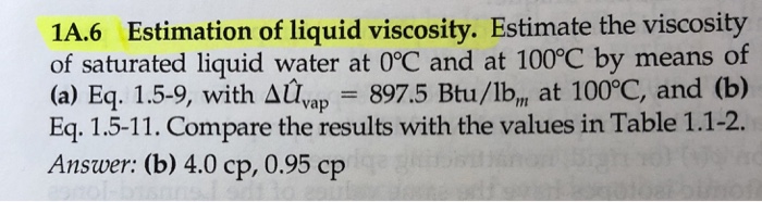 1A.6 Estimation of liquid viscosity. Estimate the viscosity of saturated liquid water at O°C and at 100°C by means of (a) Eq. 1.5-9, with Auyap 897.5 Btu/lb, at 100°C, and (b) Eq. 1.5-11. Compare the results with the values in Table 1.1-2 Answer: (b) 4.0 cp, 0.95 cp