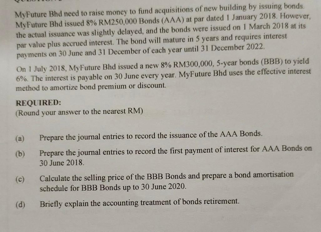 MyFuture Bhd need to raise money to fund acquisitions of new building by issuing bonds. MyFuture Bhd issued 8% RM250,000 Bonds (AAA) at par dated 1 January 2018. However, the actual issuance was slightly delayed, and the bonds were issued on 1 March 2018 at its par value plus accrued interest. The bond will mature in 5 years and requires interest payments on 30 June and 31 December of each year until 31 December 2022. On 1 July 2018, MyFuture Bhd issued a new 8% RM300,000, 5-year bonds (BBB) to yield 6%. The interest is payable on 30 June every year. MyFuture Bhd uses the effective interest method to amortize bond premium or discount. REQUIRED: (Round your answer to the nearest RM) Prepare the journal entries to record the issuance of the AAA Bonds. (b) Prepare the journal entries to record the first payment of interest for AAA Bonds on 30 June 2018 (C) Calculate the selling price of the BBB Bonds and prepare a bond amortisation schedule for BBB Bonds up to 30 June 2020. (d) Briefly explain the accounting treatment of bonds retirement.
