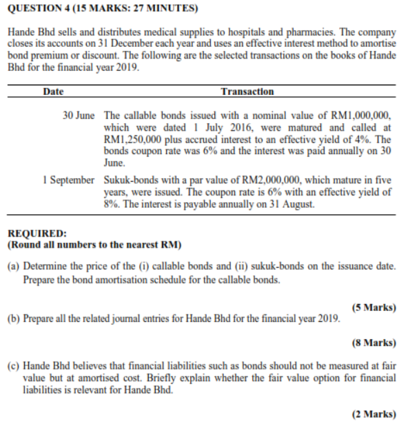 QUESTION 4 (15 MARKS: 27 MINUTES) Hande Bhd sells and distributes medical supplies to hospitals and pharmacies. The company closes its accounts on 31 December each year and uses an effective interest method to amortise bond premium or discount. The following are the selected transactions on the books of Hande Bhd for the financial year 2019. Date Transaction 30 June The callable bonds issued with a nominal value of RM1,000,000, which were dated 1 July 2016, were matured and called at RM1,250,000 plus accrued interest to an effective yield of 4%. The bonds coupon rate was 6% and the interest was paid annually on 30 June. 1 September Sukuk-bonds with a par value of RM2,000,000, which mature in five years, were issued. The coupon rate is 6% with an effective yield of 8%. The interest is payable annually on 31 August REQUIRED: (Round all numbers to the nearest RM) (a) Determine the price of the (i) callable bonds and (ii) sukuk-bonds on the issuance date. Prepare the bond amortisation schedule for the callable bonds. (5 Marks) (b) Prepare all the related journal entries for Hande Bhd for the financial year 2019. (8 Marks) (c) Hande Bhd believes that financial liabilities such as bonds should not be measured at fair value but at amortised cost. Briefly explain whether the fair value option for financial liabilities is relevant for Hande Bhd. (2 Marks)