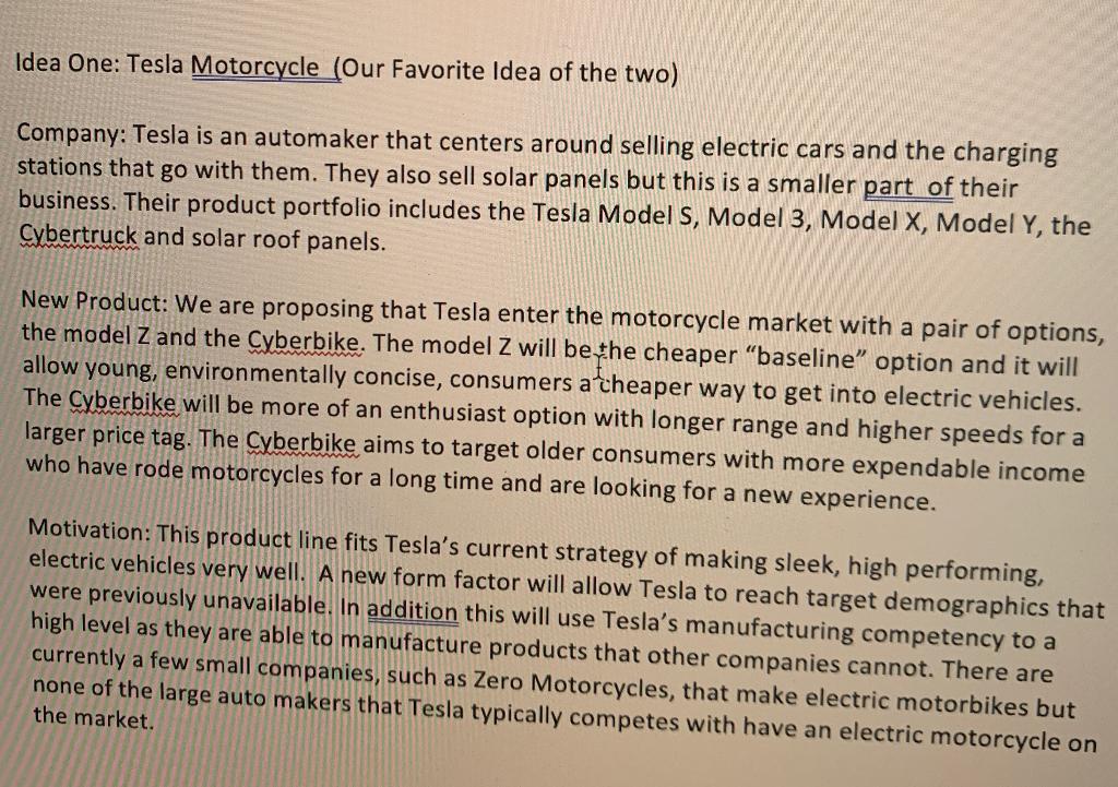 Question: The Company Is Tesla And The New Product Would Be An Electric Motorcycle.